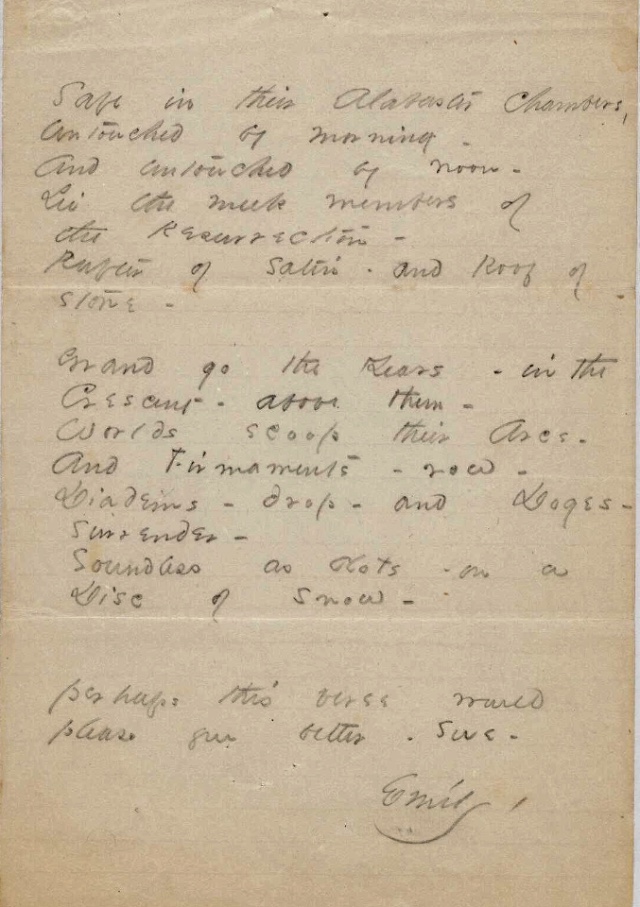 Beeld: handschrift van de tweede en definitieve versie van dit gedicht, zoals E.D. het naar haar schoonzuster stuurde om commentaar. Susan Dickinson, die in het aangrenzende huis woonde, was in die periode haar eerste lezer en raadgever. In totaal maakte Dickinson drie verschillende versies van het tweede couplet. Als persoonlijk woord schrijft Emily haar schoonzuster onder het gedicht: ‘Perhaps this verse should please you better, Sue, Emily’